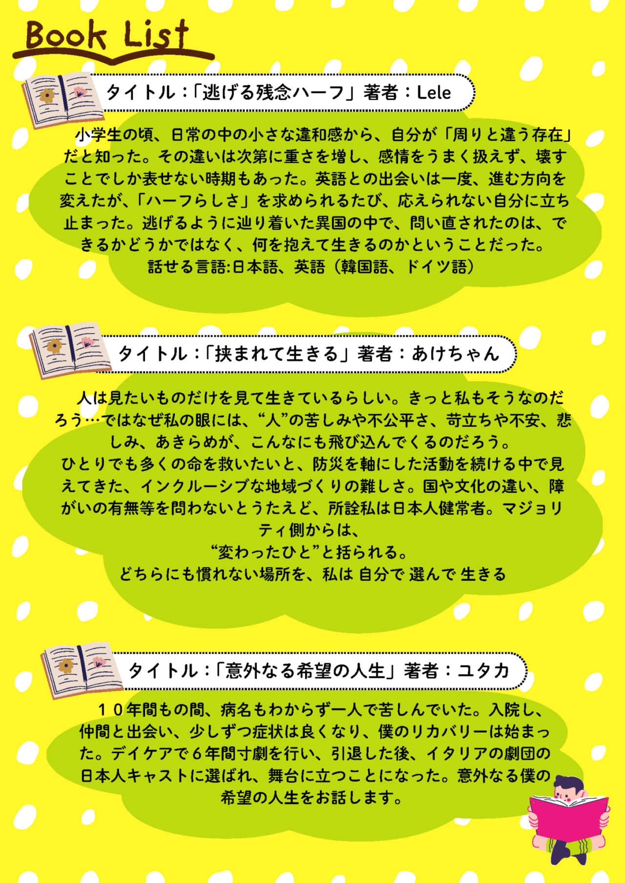 生きた人間を「本」として貸出し、その人の人生や経験、思いを語ってもらい、「読者」に当たる聞き手と、「司書」にあたる主催者が、「本」と対話しながらお互いの理解や考えを深めていくコミュニケーションです。